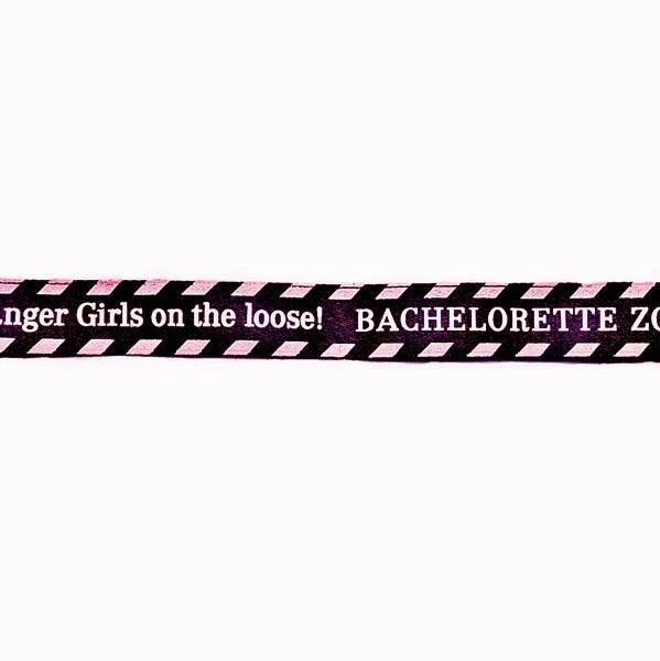 This “Bachelorette Zone Danger Girls on the Loose” ribbon is the appropriate accessory for a wild bachelorette party. It coordinates with the Caution Bachelorette tape and the Bachelorette Party Outta control party and car decorations.There are warning bachelorette party and gift bags to add to the theme. A cute way to personalize the favor bags for the party guests. The Ribbon so many uses for the Bride to Be’s final fling.