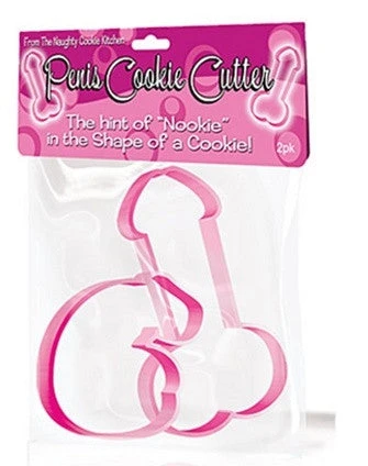 2 different shape cutters in each package. Bent Penis Cutter size is roughly 4″ x 4″. Straight Penis cutter size is 6″ x 3.5″.