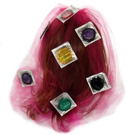 Just like our White Condom Veil, it comes with 8 condoms of assorted colors and safety pins to attach the condoms to the veil. The bride to be can wear a black veil underneath to make the pink veil pop. If the party is headed for town this is a fun way for the Bachelorette to get attention and drinks.