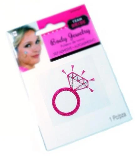 This Diamond Ring bejeweled Sticker Tattoo says it all…Girls love bling! The Bride to Be will sparkle with this tattoo on her cheek.This tattoo has a lot of glitz and will make the Bachelorette glow at her party. Cute on a tank top, sash or party gift bag.Â