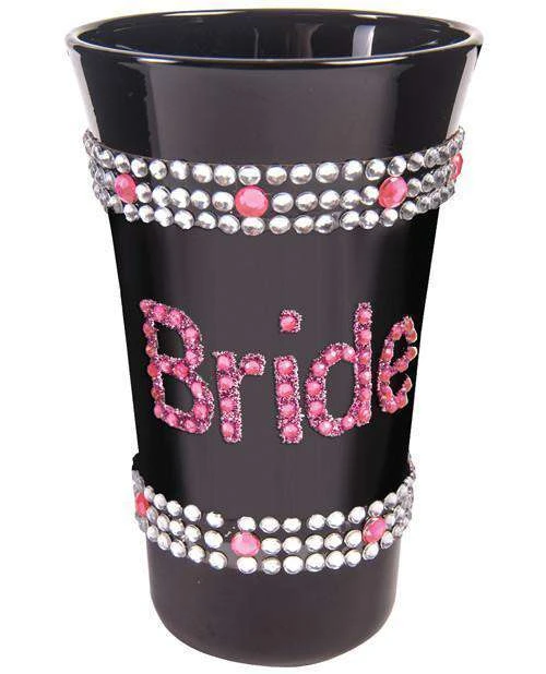 The Bride should have a special shot glass for her special event! This shot glass has enough Bling on it to make any Bride to Be happy. The pink rhinestone Bride really stands out on this quality black glass shot.
