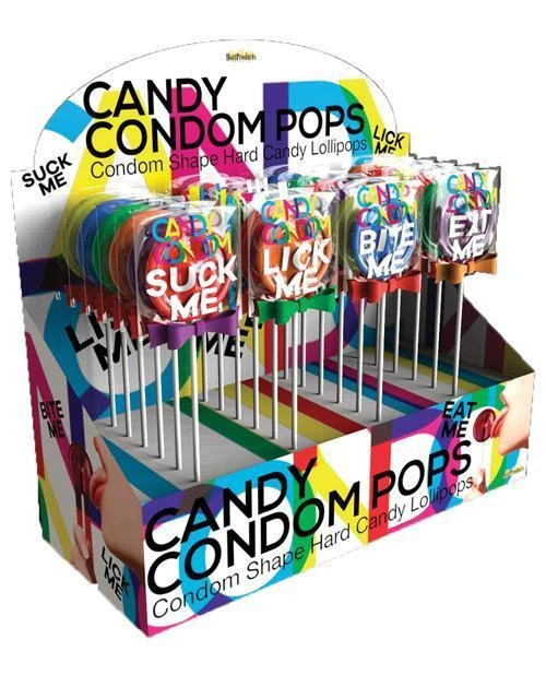 Fruit Flavored Condom Pops are lickable fun! A hilarious party favor. Assorted Flavors and colors. Each lollipop is about 2″ wide and wrapped in a clear wrapper that says “Eat Me” or “Lick Me” or “Bite Me” or “Suck Me”. A playful and yummy gift for your party guests. Perfect for your next Bachelorette or Adult Party. Place in a small vase for a colorful edible bouquet. Toss some flavored and colored condoms around for a super fun party table. Check our condom assortment and condom veil.