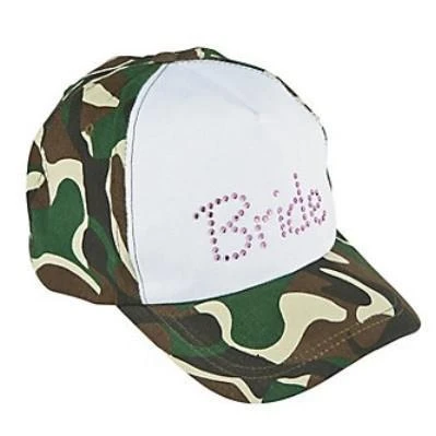 The Camouflage Bride Hat is for the “outdoorsy” Bride to be to wear at her Bachelorette Party or Bridal shower. This is such a cute hat it may become the Bride’s favorite. The Hat is made of soft cotton fabric with camouflage print on everything but the white front panel that has the word “Bride” written with pink rhinestones. Back of hat has a Velcro sizing straps- for a perfect fit. Add a veil.There is a Camouflage Groom hat to match the Bride to Be. If the couple are into out door activities the Camouflage hat will be perfect for the Bachelorette or Bachelor Bash.