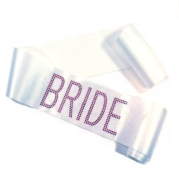 Bling up the Bride with our White sash that reads “BRIDE”. We used sparkly pink rhinestones to form the letters, giving the word “BRIDE” a nice pop off of the white satin background.